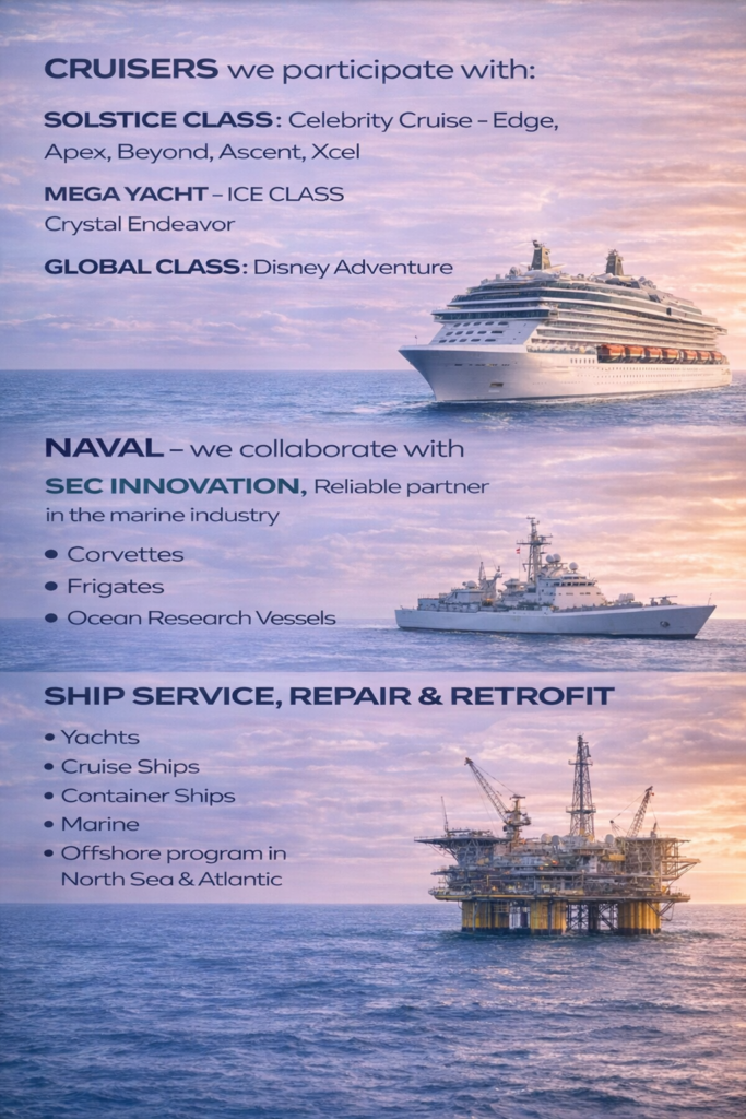 Our project experience ranges from new ship construction and commissioning to comprehensive ship service and repair operations, including ABC fire extinguishing systems, specialized pipe construction, and thorough yacht inspections for regulatory compliance.
